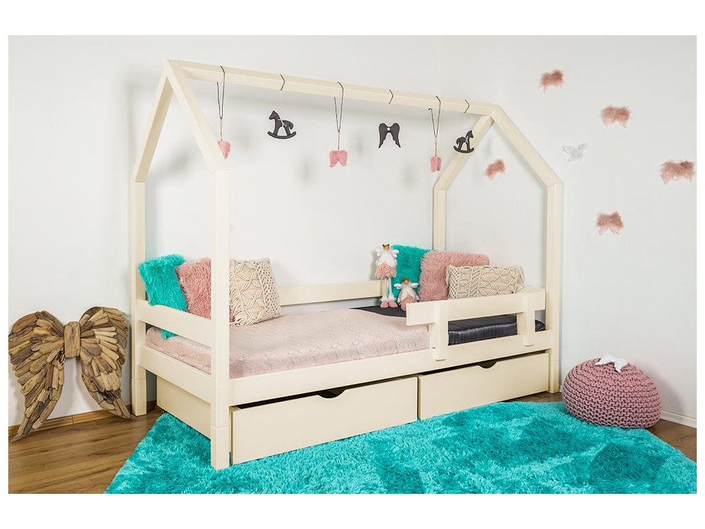 Postel je velmi pohodlná a bezpečná. Rošt pro matraci je umístěn nízko nad zemí tak, aby děti měly do postele jednoduchý a bezpěčný přístup. Děti rády postel vyžívají nejen k spaní, ale také i k hraní a stavění nejrůznějších bunkrů. Konstrukce této domečkové postele je na stavění skrýši jak dělaná. Bezpečnost dětské prostele zajistí zábrana, která zejména u malých dětí zabrání vypadnutí z postele a zajistí bezstarostné snění. Mohla by se Vám k posteli líbit přistýlka, která je včetně roštu a zajistí plnohodnotné spaní další osoby. Úložného prostoru není níkdy dost a s tím pomůžou naše úložné šuplíky.
