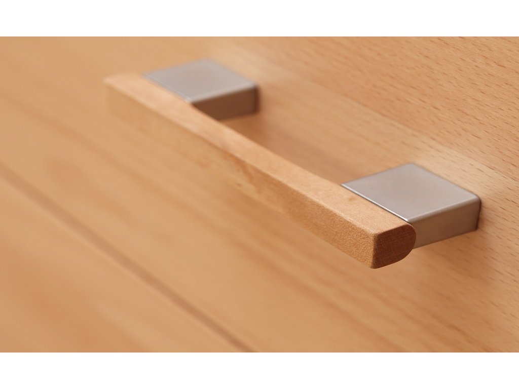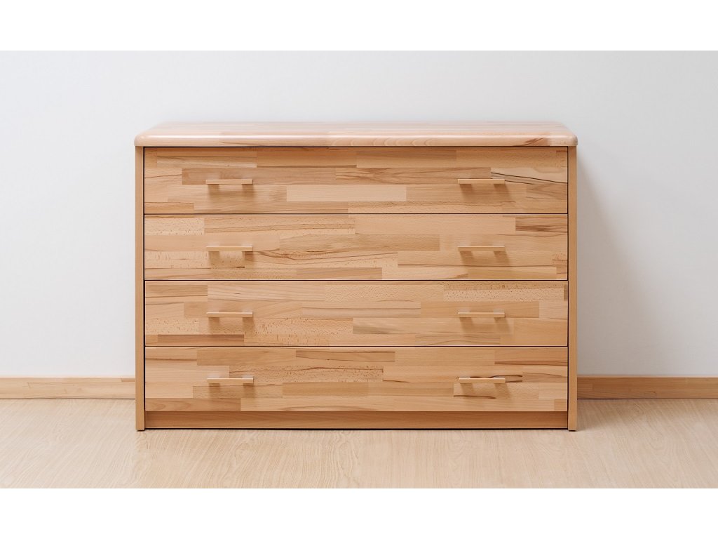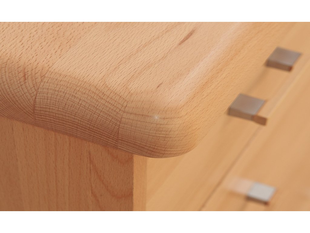 V provedení Buk/Dub se jedná o kombinaci přírodní dýhy (boky, dna a mezistěny), masivního dřeva (horní desky a přední plochy) a masivní bukové překližky (obvody zásuvek a záda komod).