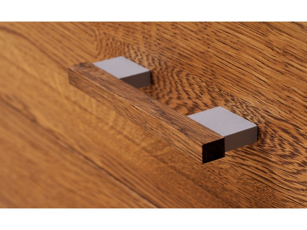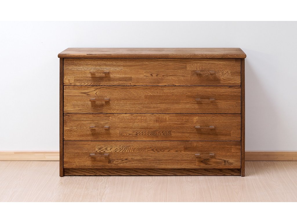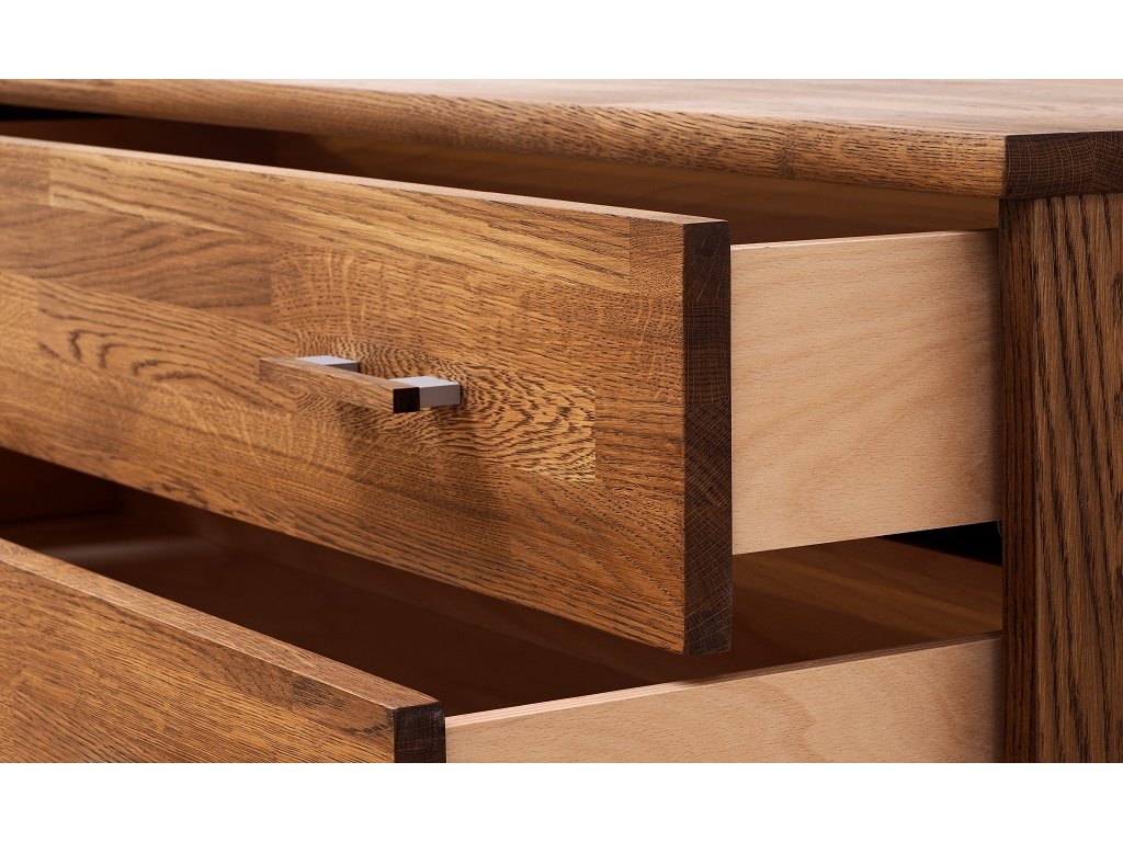 V provedení Buk/Dub se jedná o kombinaci přírodní dýhy (boky, dna a mezistěny), masivního dřeva (horní desky a přední plochy) a masivní bukové překližky (obvody zásuvek a záda komod).
