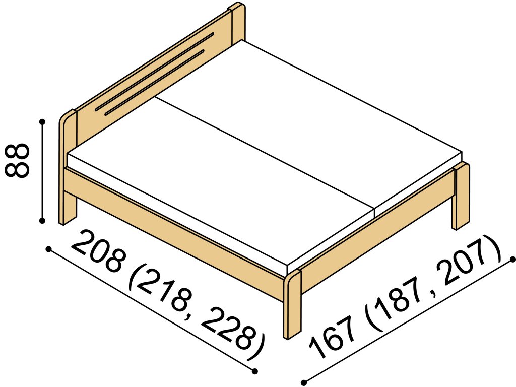- Kování pro uložení roštu je výškově nastavitelné. Výška lůžka po horní hranu bočnice je 47 cm.