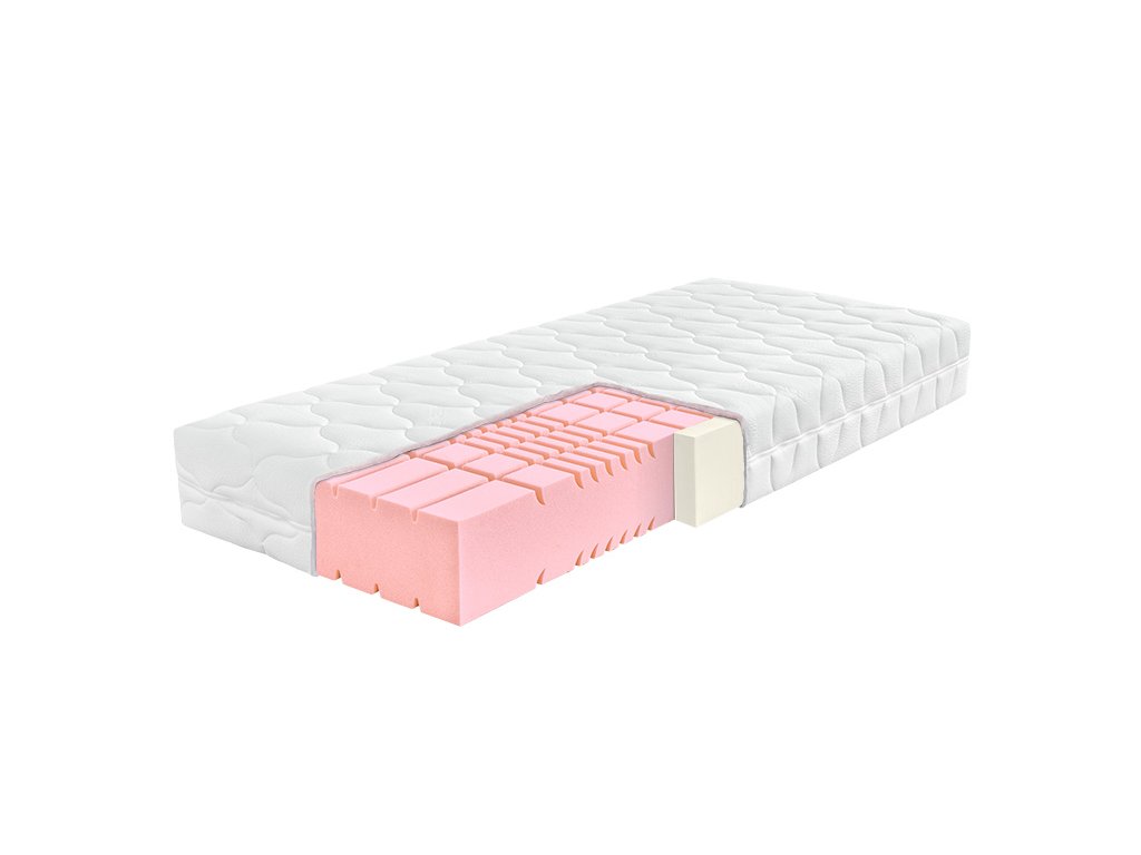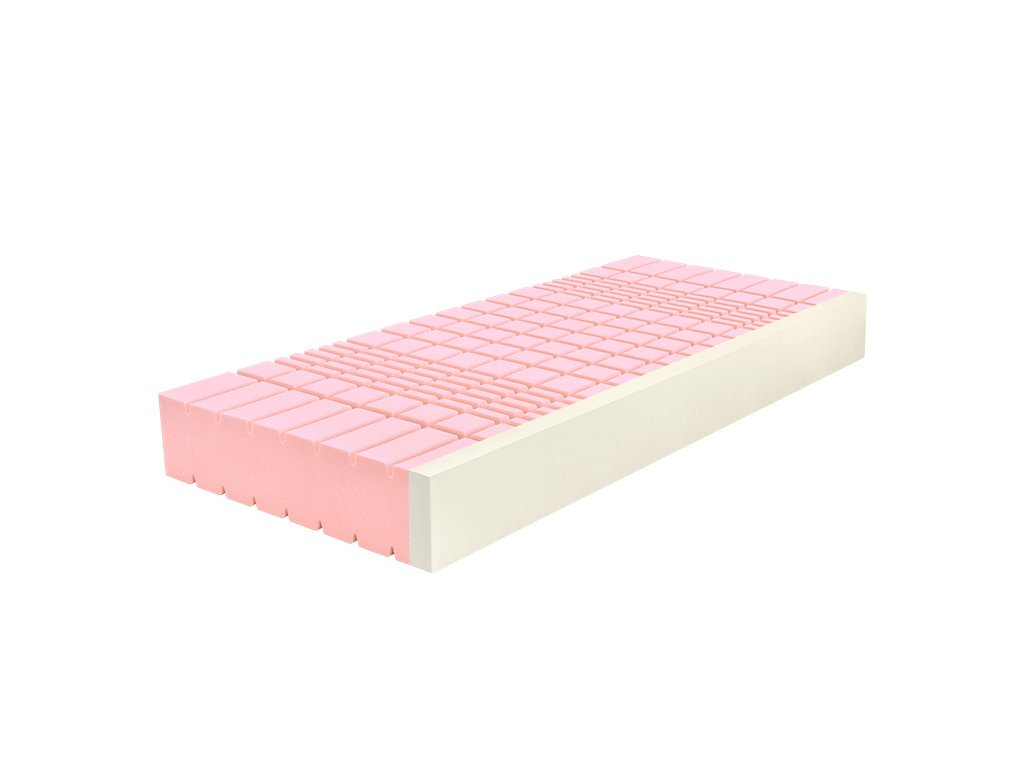 HR pěna s hustotou 50 kg/m³ v kombinaci s antidekubitními prořezy poskytuje zdravé rozložení tlaku a maximální pohodlí. Zpevněné boky zajišťují lepší stabilitu při vstávání i uléhání.